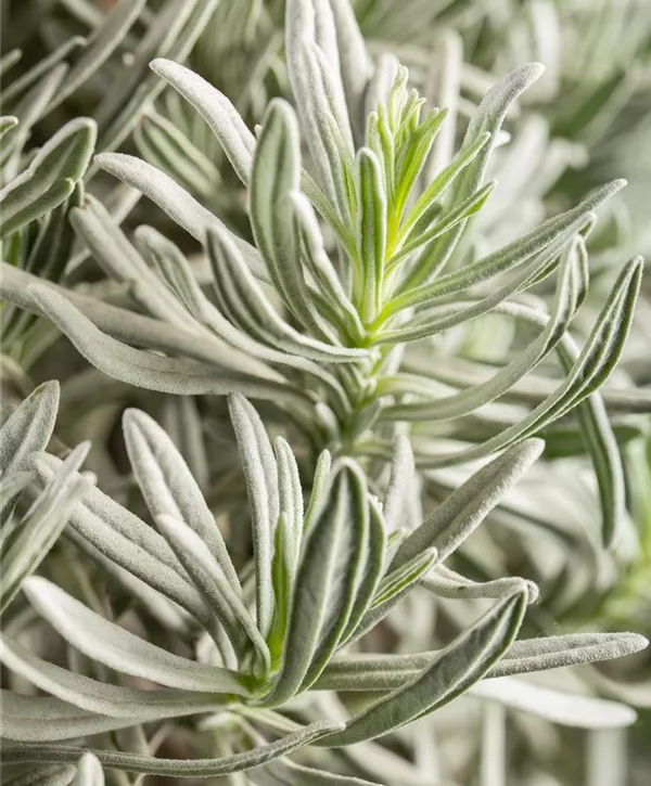 Zum Verzehr geeignet. Die immergrünen Blätter des Echten Lavendels 'Silver Mist' sind silbergrau, lanzettlich. Sie verströmen einen angenehmen Duft.