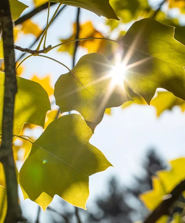 Die sommergrünen Blätter des Amerikanischen Tulpenbaums sind mittelgrün, eiförmig, wechselständig, gelappt. Amerikanischer Tulpenbaum zeigt sich leuchtend goldgelb im Herbst.