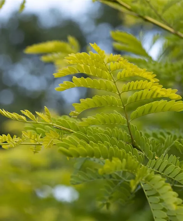 Die sommergrünen Blätter des Seidenbaums sind mittelgrün, gefiedert. Seidenbaum zeigt sich leuchtend gelb-grün im Herbst.
