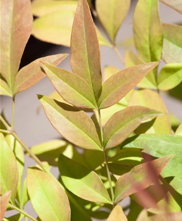 Die immergrünen Blätter des Heiligen Bambus sind grün-rot, lanzettlich. Heiliger Bambus zeigt sich leuchtend purpurrot im Herbst.