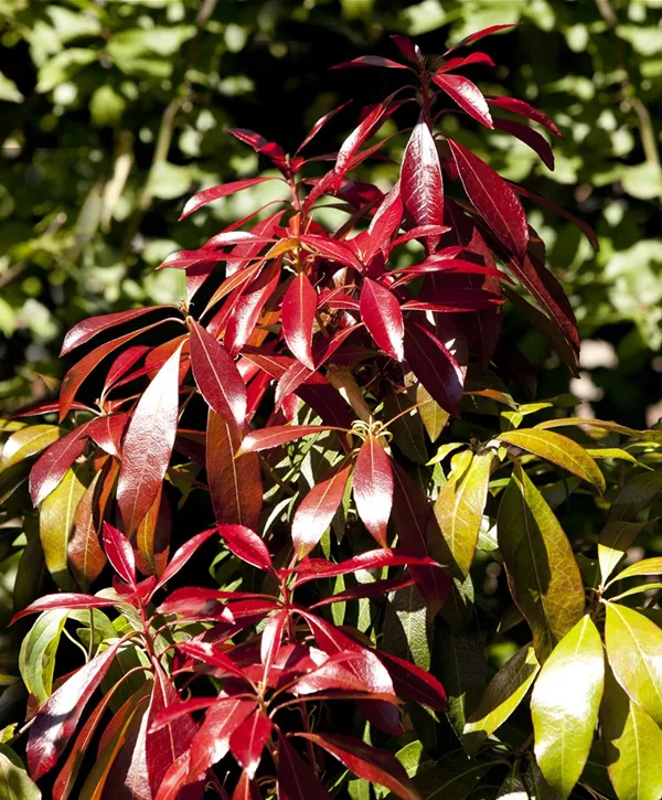 Seine lanzettlichen Blätter sind dunkelgrün. Rot im Austrieb.