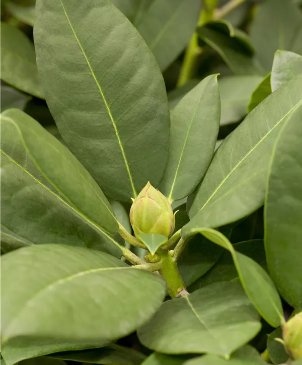 Der Großblumige Rhododendron ist immergrün und trägt dunkelgrüne lanzettliche Blätter.