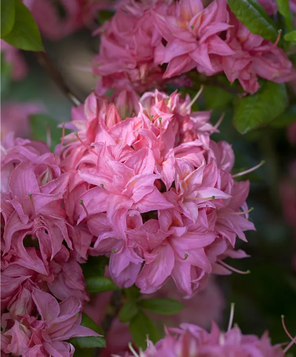 Eine runde Sache erwartet Sie, wenn die Sommergrüne Azalee 'Homebush' Mitte Mai zu blühen beginnt. Die rosa Blüten erscheinen wie aufgespießte Kugeln und damit verfügt die Pflanze über ein Alleinstellungsmerkmal in der Familie der Knap-Hill Hybriden. Die winterharte Pflanze bevorzugt einen halbschattigen Standort und einen lockeren und durchlässigen Boden. In etwa zehn Jahren wird aus der Sommergrünen Azalee 'Homebush' ein zirka 1,5 Meter hoher Strauch.