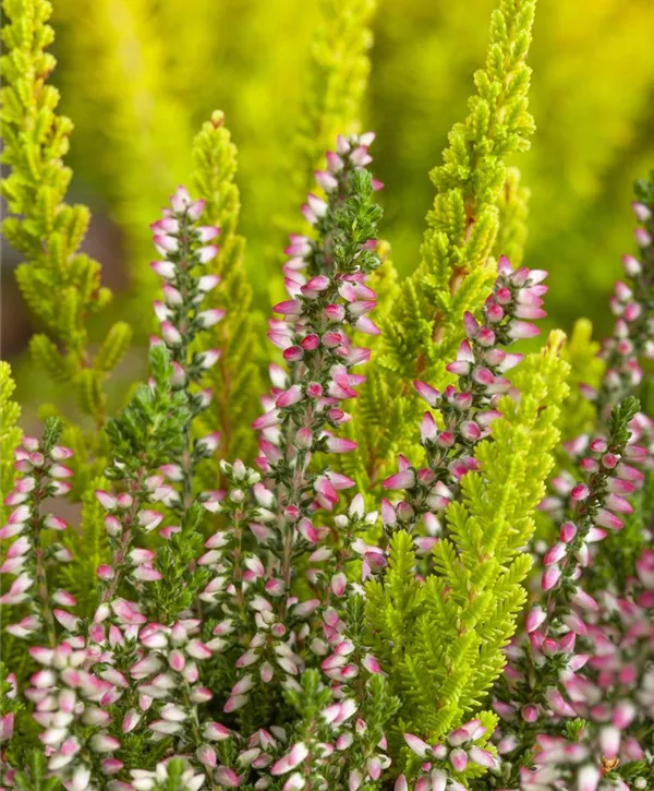 Die Knospenblüherheide 'Beauty Ladies - Twins' bildet mehrfarbige, leicht duftende Blüten von Juli bis Oktober.